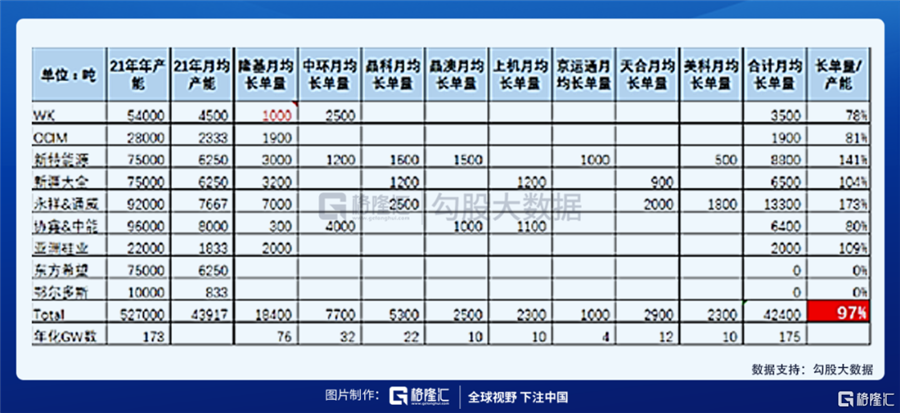 据统计,2021年仅有通威7.5万吨于2021年10月和2021年12月底投产;大全新能源3.5万吨于2021年12月底投产;亚洲硅业3万吨于2021年6月底投产;预计2021年可达产能193GW,仅能满足下游60%的需求。