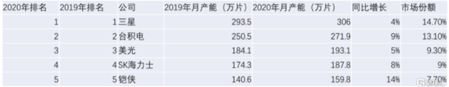 但8寸晶圆的产能却远跟不上需求增长的速度,甚至8寸晶圆厂在逐年关闭。在中国大陆来说,芯片项目在技术先进性上的导向以及盈利,很多项目在落地时就瞄准了12寸产线,还有一些8寸产线转成12寸产线。根据第三方数据机构IC Insights统计,三星电子2020年底月产能为306.0万片8寸晶圆,位居第一大厂,其次为台积电。