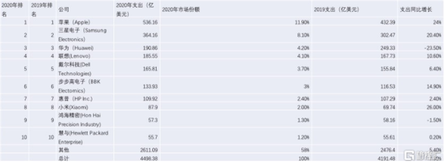 除了8寸晶圆厂的数量减少,动荡的政治环境也是造成供需紧张的原因,一些大型公司加大囤芯力度,备货量大幅增加。这使得芯片需求市场更加紧张。手机厂商在2020年芯片采购支出上的金额上涨,根据第三方市场调研机构Gartner的数据,2020年全球芯片采购支出达4498亿美元,较2019年增长7.3%。支出金额排名前五的厂商分别是苹果、三星电子、华为、联想、戴尔科技。华为公司在2020年的芯片采购支出下降了23.5%。