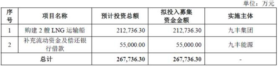 而此次上市,九丰拟发行不超过1.2亿股,不超过发行后总股本25%,拟募资26.7亿元,其中21.3亿九丰准备用来购建2艘LNG运输船,由于东莞接收站最大只能接卸5万吨级,船型特殊目前都是租赁,按照之前签订的合同,这2艘船将由中国船舶和江南造船厂来建造。