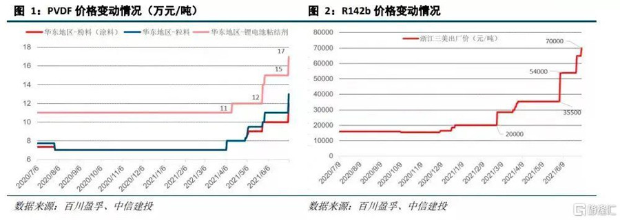据百川盈孚,截至目前,华东地区-粒料PVDF已涨至16万元/吨,较今年4月份上涨了近130%,其中电池级PVDF价格已达18万元/吨,3个月内涨幅超过60%。