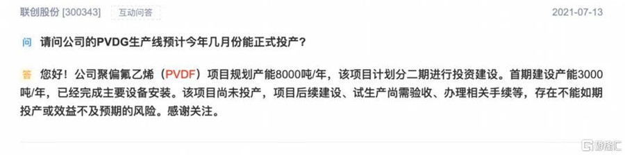 7月13日,联创股份在投资者互动平台表示,PVDF项目规划产能8000吨/年,该项目计划分二期进行投资建设。首期建设产能3000吨/年,已经完成主要设备安装。该项目尚未投产,项目后续建设、试生产尚需验收、办理相关手续等,存在不能如期投产或效益不及预期的风险。