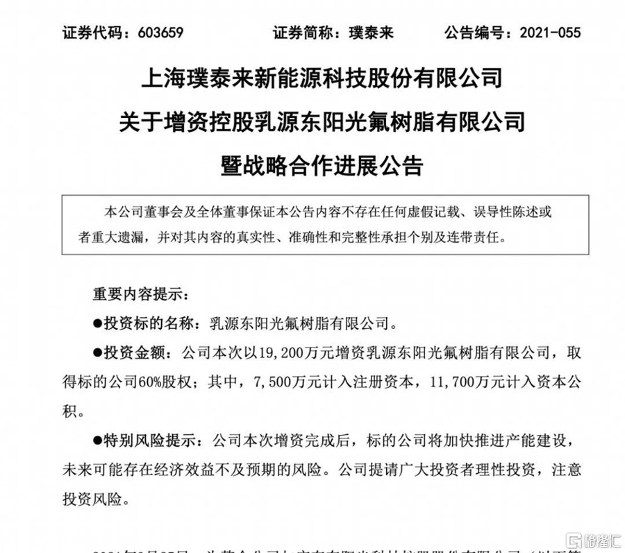 公司表示,PVDF具备优异的耐化学性、电绝缘性,是锂离子电池产业链重要的涂覆材料和粘结剂,公司本次增资控股乳源东阳光氟树脂有限公司,有利于公司进一步完善在基膜、涂覆材料、粘结剂、涂覆设备与涂覆加工的产业闭环,与公司粘结剂业务形成有效的产业协同,并扩展公司粘结剂业务产品线,持续完善公司在新能源锂电池关键材料领域的布局。