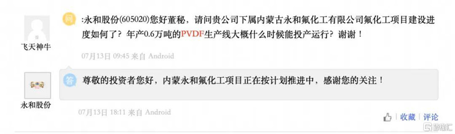 7月9日,永和股份登陆沪市主板,公司拥有从上游萤石矿资源到下游高分子氟化工品的完整产业链。近日,有投资者在互动平台向公司提问:“请问贵公司下属内蒙古永和氟化工项目建设进度如何?年产0.6万吨PVDF生产线大概什么时候能投产运行?”公司表示,内蒙古永和氟化工项目正在按计划推进中。