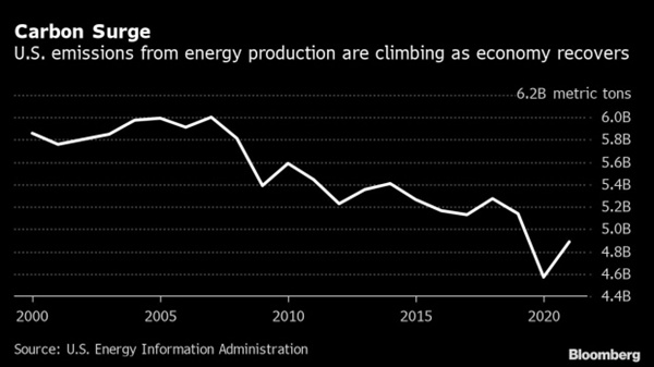美东时间周二,美国能源信息署(EIA)表示,今年美国碳排放量将增加 7%,创下自1990年以来的最大增幅。