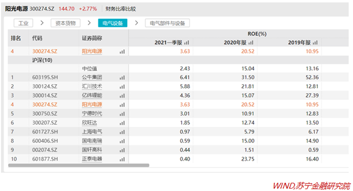 值得投资。首先逆变器行业是个好行业。2020年,根据逆变器厂商的年报,2020年逆变器厂商净利润同比增长82.2%,平均净资产收益率(Return on Equity,简称ROE)达14.7%。其次阳光电源是一个好企业,阳光电源 2020年ROE为20.36%,是高于逆变器厂商的平均ROE的。在WIND电气部件与设备行业分类里面,从2020年到2021年Q1,阳光电源的ROE都排名第四。