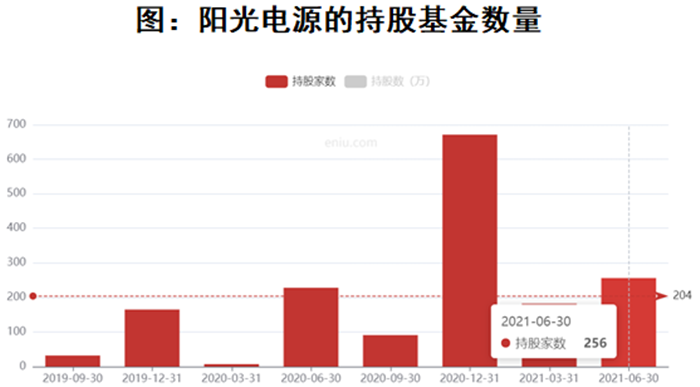 其次,跟随基金的脚步来看,截至2021年6月30日,持股阳光电源的基金数量处于历史第二高位,为256家,持股数15479.87万股,占总股本10.62%。同期中,逆变器全球前十中其他上市中国厂家中,锦浪科技的持股基金数量为53家,上能电气的持股基金数量为6家,固德威的持股基金42家。从基金的步伐就可以看出资金对于逆变器厂家的选择。