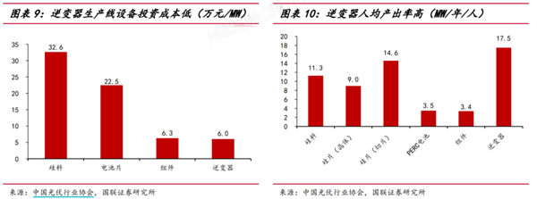 2020年,逆变器单位容量生产设备投资成本为6.0万元/MW,在光伏产业链中处于低位。而逆变器生产线直接员工的人均产出约为17.5MW/年/人,高于产业链其他环节。成为产业链里资产投入低人均产出高的主要环节。