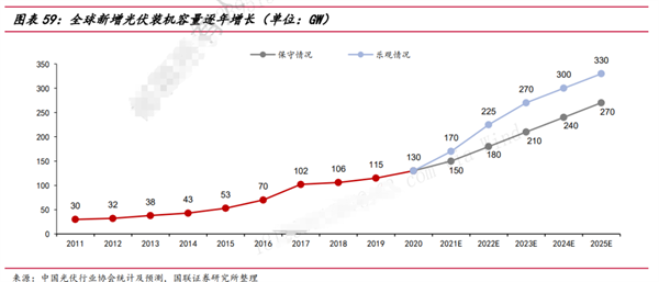 在2020年,全球光伏市场在新冠疫情的影响下依旧实现了加速增长,全年新增装机量约130GW,同比增长13.0%,全球范围内光伏新增装机需求持续提升。受益于光伏装机量的增长,据Wood Mackenzie,2020年作为光伏系统的必要设备,全球光伏逆变器出货量185.14GW,较2019年大幅增长43%。
