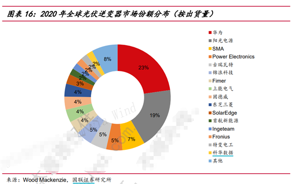 据Wood Machenzie,2020年全球光伏逆变器企业出货量Top10中国内企业占6席,华为和阳光电源构成了全球光伏逆变器企业的第一梯队,2020年出货量分别为41.7GW和35.0GW,占全球出货量的23%和19%。中国企业Top6占据全球光伏逆变器出货量60%的市场份额,且集中度还在上升趋势中。