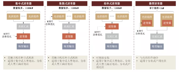 光伏逆变器主要有集中式、集散式、组串式逆变器和微型逆变器4种。这四种类别的主要区别在于逆变器的单体容量以及直接与逆变器连接的光伏组件数量不同,由此具有不同的下游应用场景。