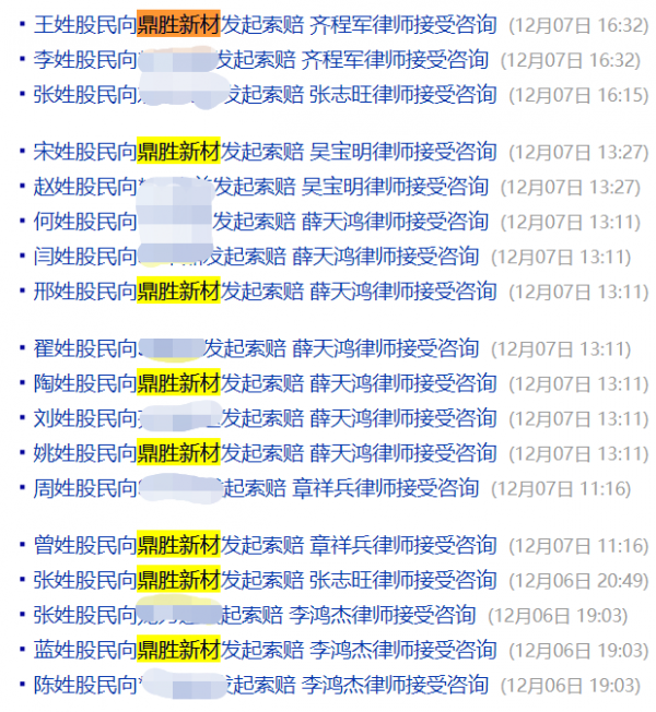 在新浪股民维权平台搜索“鼎胜新材”后,网页提示“投资者可做好索赔准备”。据记者初步统计,在12月6日和7日两天内,已有15名股民发起了索赔,此外还有股盾网和一些律师团队也在征集索赔情况。后续调查情况与调查结果有待公司进一步披露。