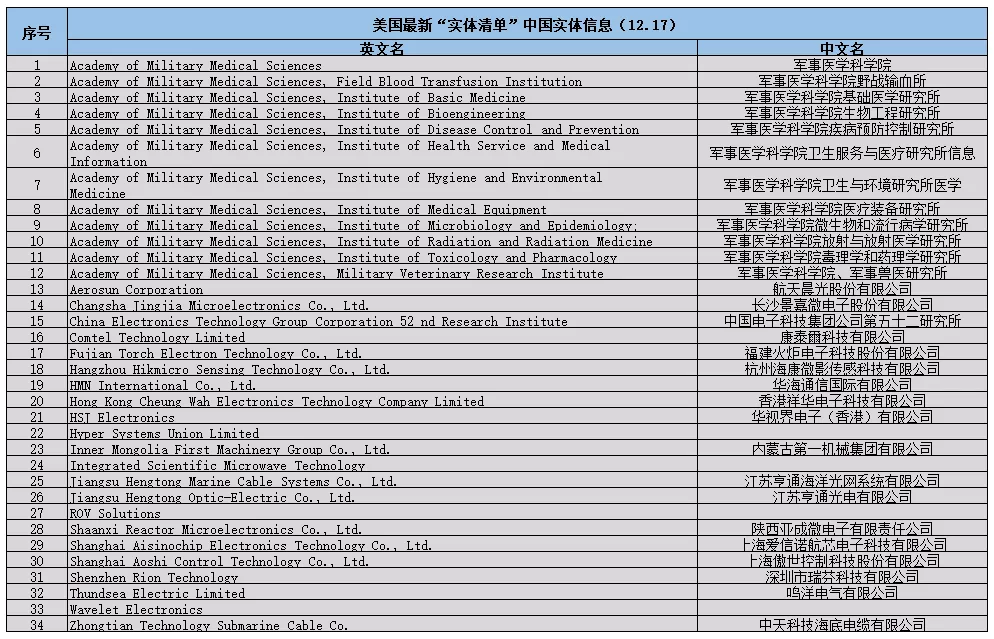 华夏能源网(www.hxny.com)注意到,本次登上“黑名单”的中国实体除中国军事医学科学院(AMMS)及其11个研究所外,中天科技海底海缆有限公司(下称“中天科技”)、江苏亨通光电有限公司(下称“亨通光电”)等多家企业也榜上有名。值得一提的是,中天科技与亨通光电还分别是A股新能源板块的明星企业。
