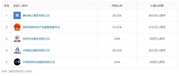 组建后的中国稀土集团,属于国务院国资委直接监管的股权多元化中央企业,国务院国资委持有31.21%的股权,赣州稀土集团、中铝集团、中国五矿股份有限公司分别持股20.33%,有研科技集团有限公司与中国钢研科技集团有限公司分别持股3.9%。