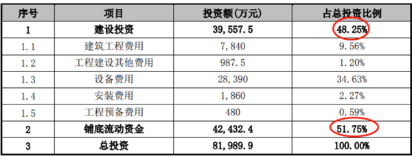 从投资资金的用途看,有超过一半的资金用于铺底流动资金,这主要在项目建设后期及运行中使用,短期资金需求并不紧迫。
