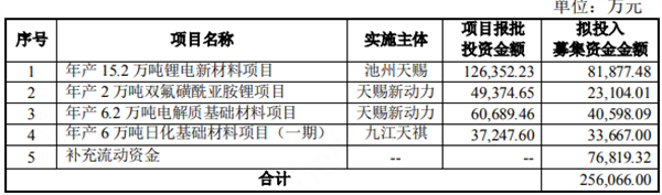 据该公司12月11日披露的董事会决议,天赐材料拟公开发行可转换公司债券募资不超过25.6066亿元,用于年产15.2万吨锂电新材料项目等4个项目以及补充流动资金。