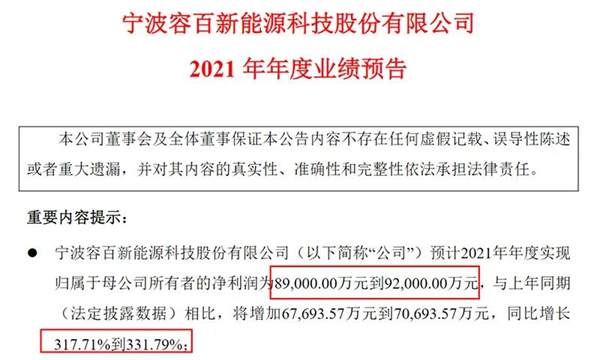 容百科技预计盈利8.9亿元至9.2亿元,同比增长318%到332%。扣除非经常性损益后,预计盈利8亿元至8.3亿元,同比增长399.58%到418%。