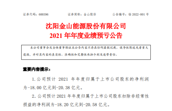 1月5日晚间,金山股份(金山股份,600396)发布公告:公司预计2021年归属上市公司股东净利润将亏损18亿元-20.38亿元,同比减少金额18.82亿元-21.20亿元。