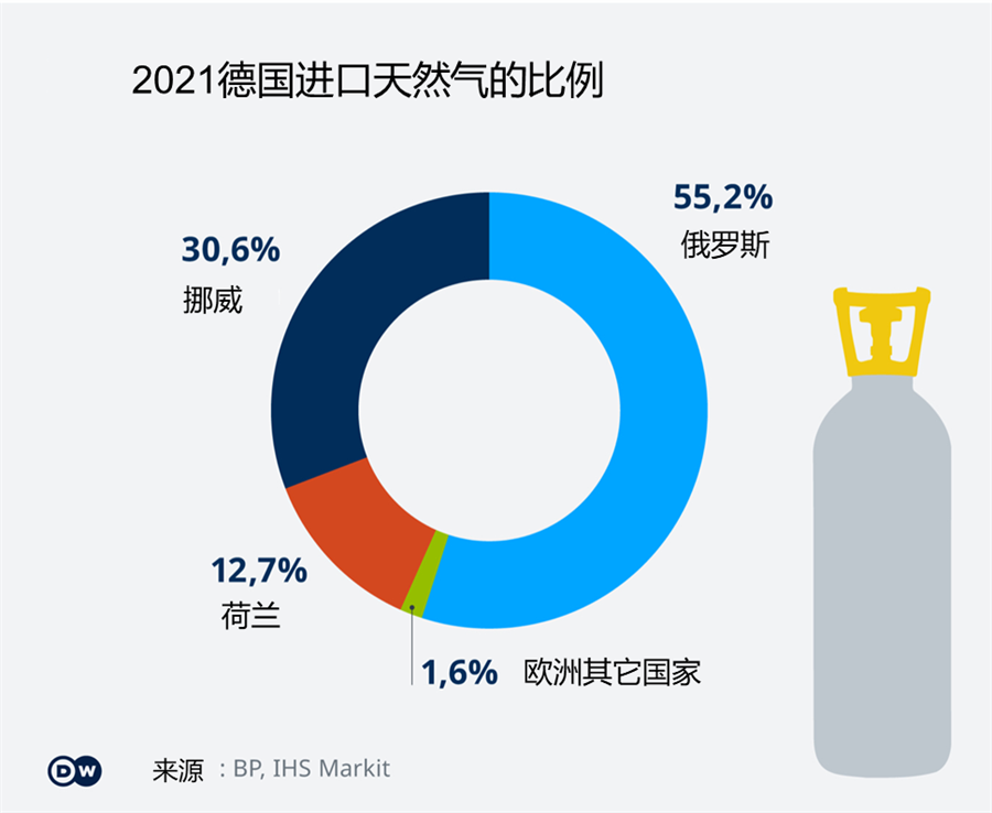 德国属于油气资源相对贫乏的国家,几乎没有自己的油井,天然气的开采量从1974年206亿立方米减少到52亿立方米,大部分靠进口,其中从俄罗斯进口的石油占整个需求的35%,天然气竟高达55%,高达500多亿立方米。德国已探明的页岩气达5000亿立方米,出于担心水力压裂技术可能会污染地下水而被禁止开采。目前,德国从俄罗斯进口的石油已经从35%下降到了12%。欧盟计划在6至8个月内对俄罗斯石油实现禁运。德国摆脱对俄罗斯天然气的依赖则要困难得多。虽然目前德国从俄罗斯进口天然气已由55%下降到了35%,但前景并非乐观。