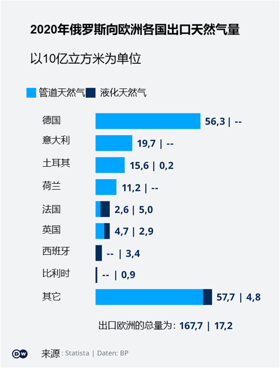 2020年俄罗斯向欧洲各国一共出口了1663亿立方米的天然气,其中德国进口了563亿立方米,占了三分之一还要多(图四)。