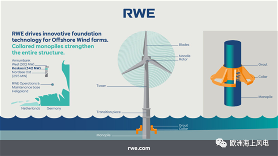 值得一提的是,除了可回收叶片,Kaskasi还引入了多项创新技术,例如“带领单桩(collared monopiles)”技术,此设计为侧向载荷提供额外承载力,提高整个结构的完整性。