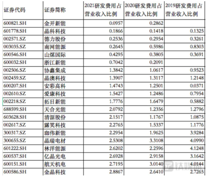 在公司和实控人都有资金压力的情况下,与同行相比,公司研发投入显得就很“吝啬”了。2019年~2021年,天合光能在研发方面的投入分别是3.63亿元、3.63亿元、9.25亿元,研发费用率分别为1.28%、1.24%和2.08%,从研发投入规模来看2021年增幅明显,从研发费用率来看变动不大。