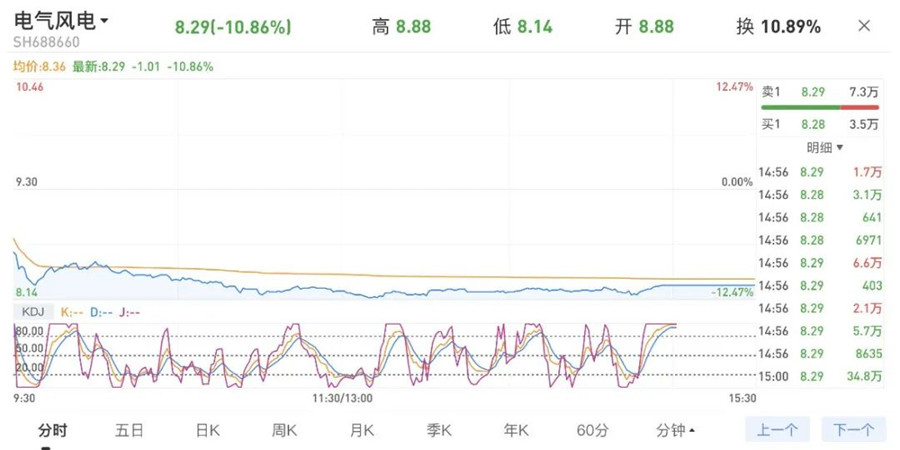 受业绩公告影响,电气风电股价自23日开盘后一路下滑,截止23日收盘,报8.29元/股,跌幅为-10.86%,总市值110.53亿元。
