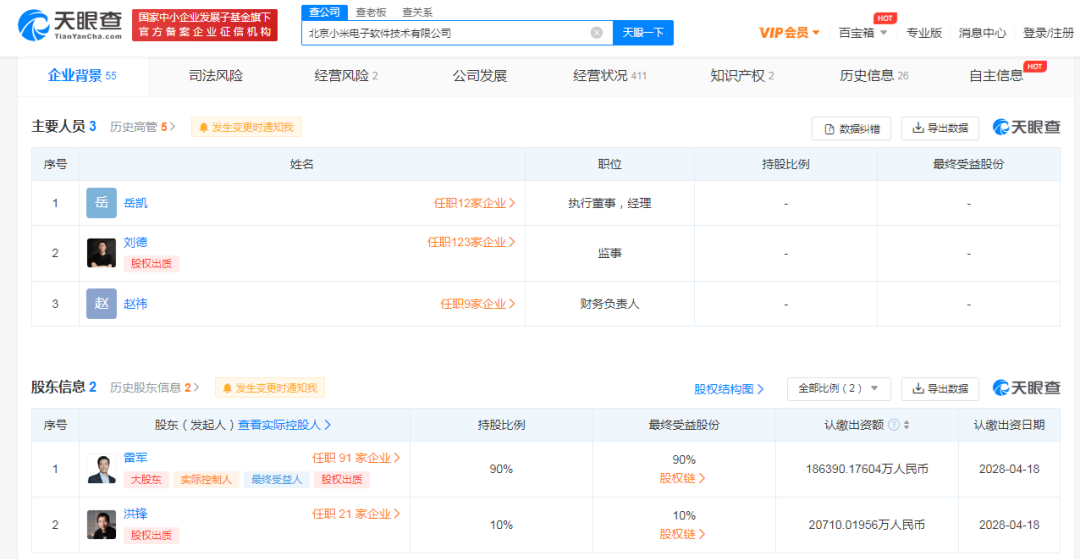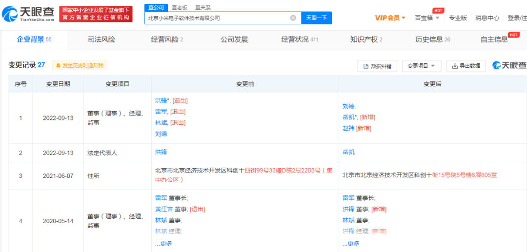 天眼查App显示,近日,天星数科关联公司北京小米电子软件技术有限公司发生工商变更,雷军卸任董事长,林斌卸任董事,洪锋卸任法定代表人、董事、经理,新增岳凯为法定代表人、执行董事、经理。