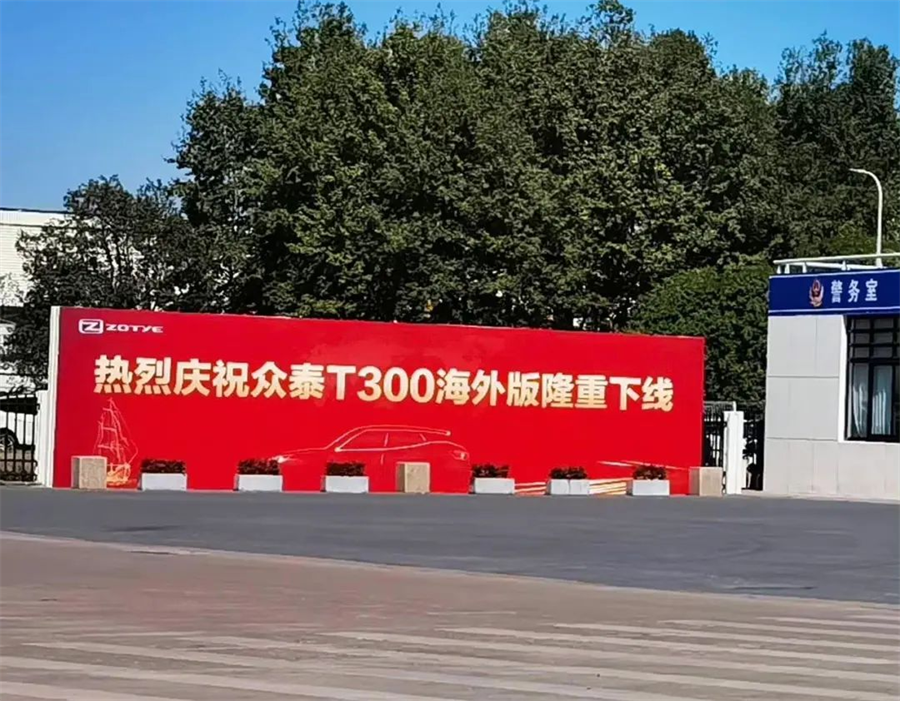 为了渲染气氛,众泰永康基地的门口早早摆上了“热烈庆祝众泰T300海外版隆重下线”的海报,路两旁也在竖起了写着“蝶变向新、蓄势待发”的红旗。