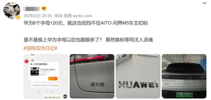 不少车主把问界M5车尾的“赛力斯”扣下,换上了网购的“华为”标识,还称“换标后,简直注入了灵魂”。