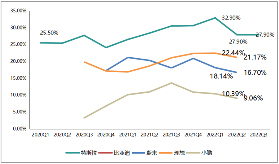先从毛利率水平来看,由于蔚小理2022Q3的数据尚未披露,比亚迪季度不拆分汽车业务,因此以2022Q2为准,对比特斯拉与蔚小理三家:特斯拉毛利率为27.9%,其次为理想21.17%,小鹏的毛利率水平最低。