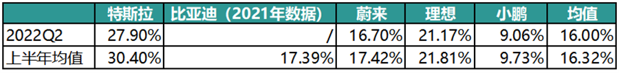 从2022年数据来看,特斯拉与国产车企的整体盈利能力水平差异被进一步放大,一季度特斯拉净利率比比亚迪高出16个百分点,二季度受到供应链影响,车企的毛利率与净利率都有所下滑,特斯拉的净利率比比亚迪高10个百分点左右。
