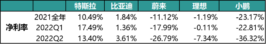 以财务报表中的最终全公司净利润计算(含汽车外业务),2021年全年特斯拉的净利率为10.49%,比亚迪1.84%,三家新势力全部亏损,其中理想的亏损比例最小。