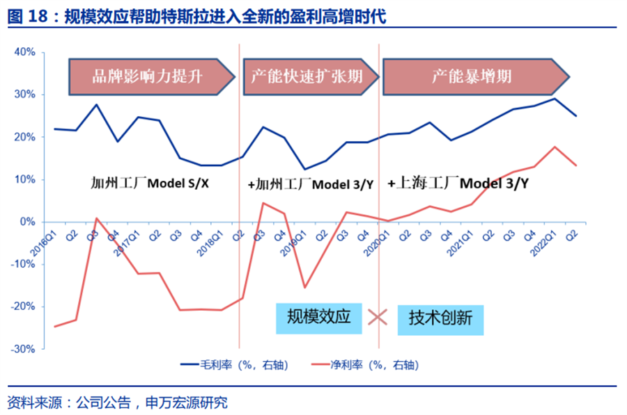 但事实上,特斯拉的利润空间始终不是静态的,历史上,特斯拉自从进入产能扩张期之后,就已经迎来了毛利率的上升阶段。
