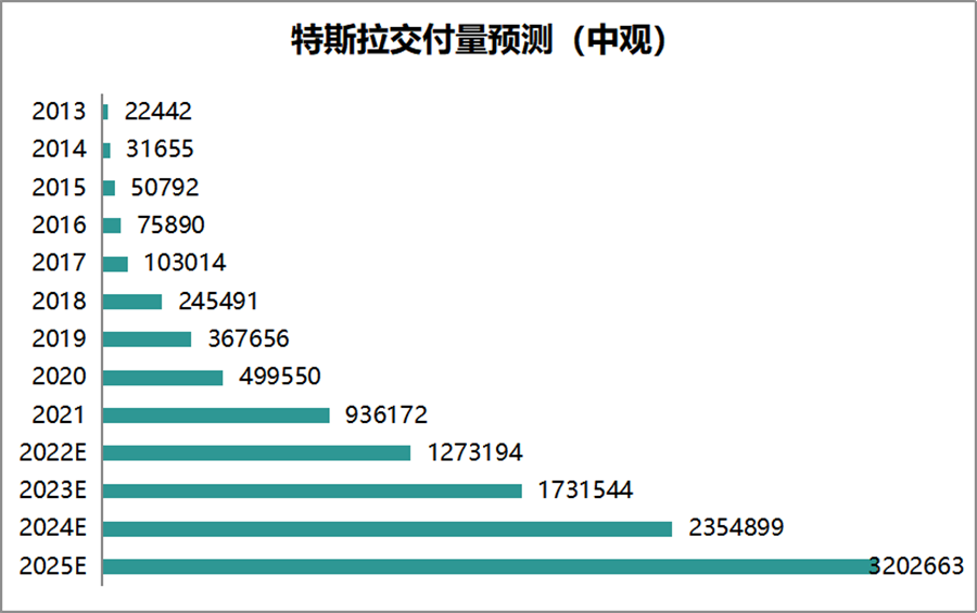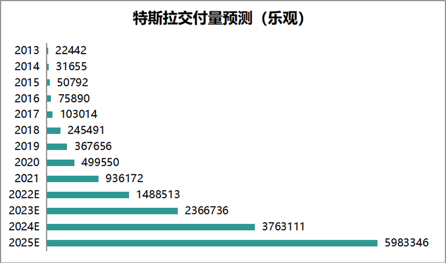 现在特斯拉的产能还在持续扩建,假设不出现极端意外情况,按照最乐观的交付量预测,以过去8年的复合增速59%作为未来3年的增速,那么到2025年特斯拉的销量将达到598万辆。