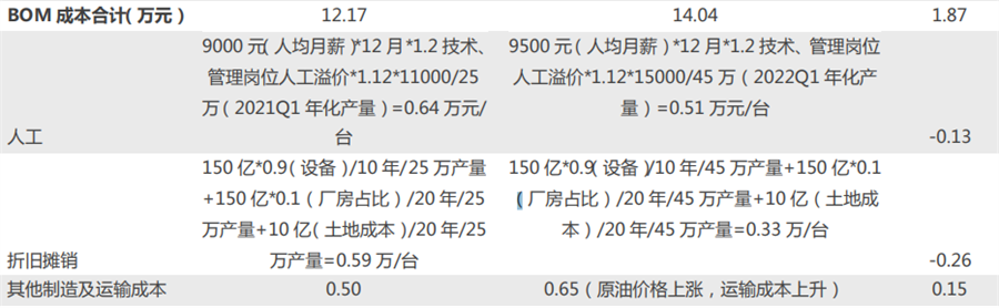 其一为BOM(单车零件)成本;其二为人工成本及摊销。