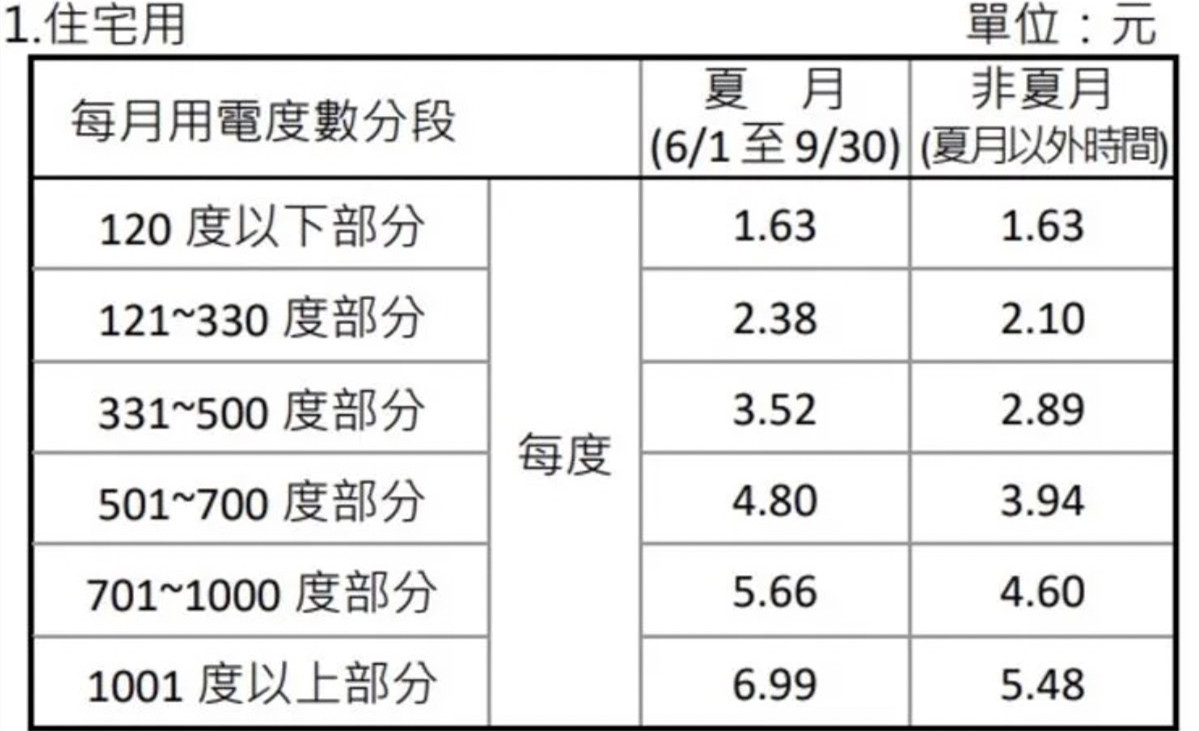一般家庭由于用电量较少且低谷时段(22:30-07:30)用电量不多,故多采用阶梯电价计费。以夏月为例,假设每月用电433度,其中的120度每度电价为1.63元新台币(与非夏月单价一致),121度-330度部分对应每度2.38元新台币,剩余103度对应3.52元新台币,逐级增加。简言之,用电量越大、单价越高。