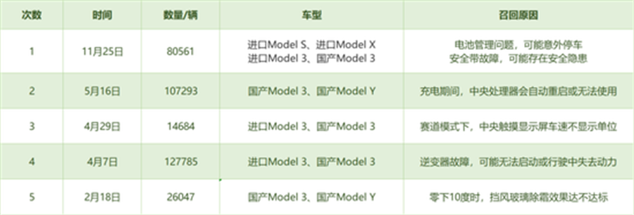 这并非特斯拉今年以来在国内市场进行的首次召回。据新浪科技不完全统计,自去年12月下旬至今,特斯拉在中国市场累计进行了5次汽车召回,涉及约402815辆电动车。其中,部分召回的车型生产时间存在重合,召回问题设计软件更新、安全带问题、车窗以及尾灯等软硬件环节。