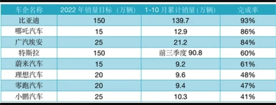 寒潮之下,曾定下2022年销量150万辆车的特斯拉也未能幸免。据媒体统计,今年1-10月,除比亚迪、广汽埃安和哪吒汽车外,其余新能源车企目前的KPI完成度均在60%以下,特斯拉前三季度总销量90.8万辆,完成率仅60%。