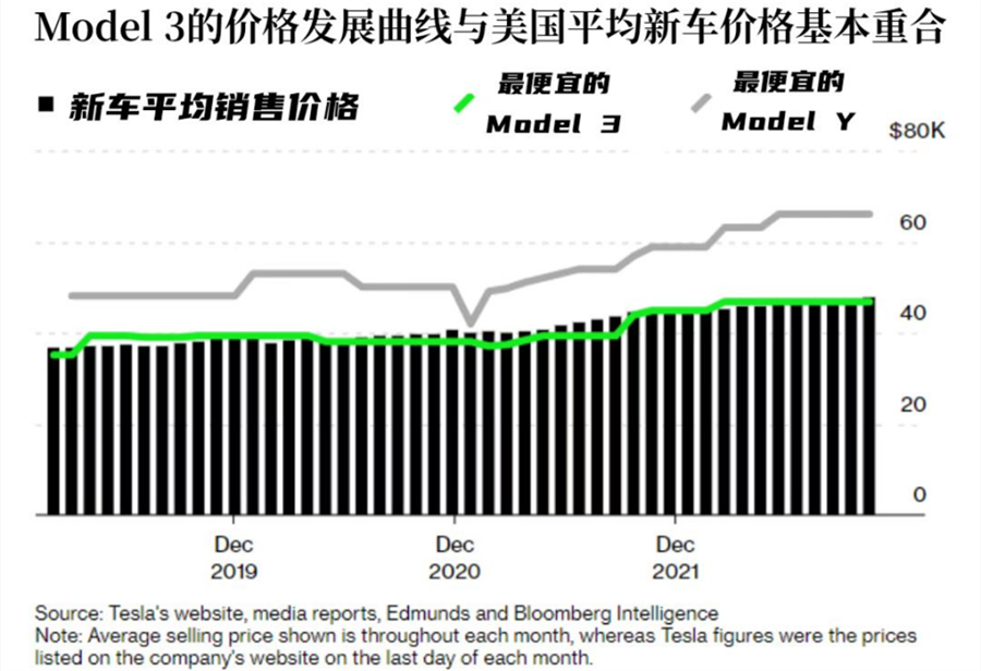 根据彭博社汇编的一项定价数据分析,2017年,当Model 3投入生产时,埃隆·马斯克(Elon Musk)宣称起价为3.5万美元,几乎完全复制了当时的新车均价——34944美元。五年后,通货膨胀爆发,一辆Model 3的价格为46990美元,而同一时间美国的新车平均价格为47692美元。