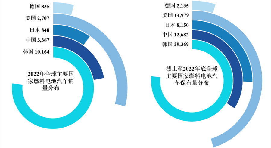 其中,中国燃料电池汽车保有量达到12,682辆;韩国燃料电池汽车保有量达到29,369辆,即将成为全球首个燃料电池汽车保有量达到3万辆的国家;美国燃料电池汽车保有量达到14,979辆;日本、德国燃料电池汽车保有量分别为8,150辆和2,135辆。