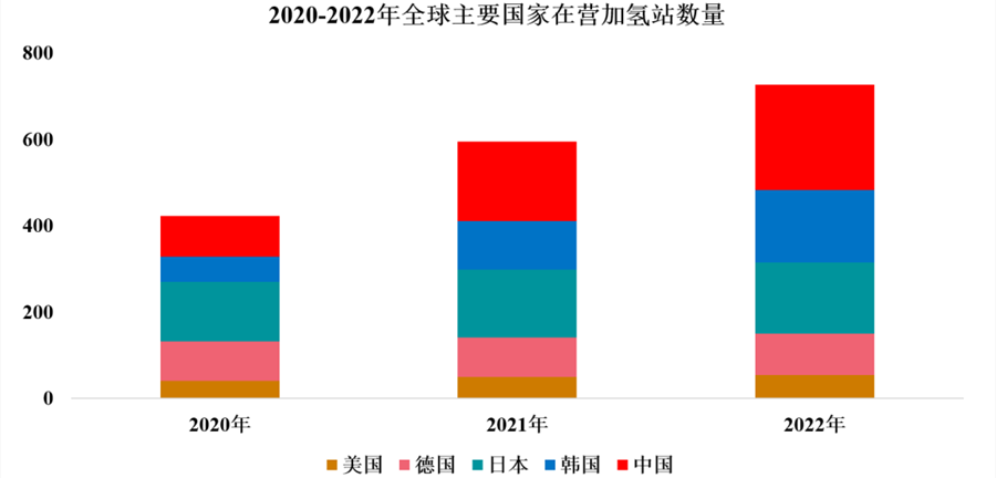 燃料电池汽车的增长带动了加氢站的增长。根据中国氢能联盟研究院统计,截至2022年底,全球主要国家在营加氢站数量达到727座,同比增长22.4%。我国累计建成运营加氢站358座,同比增长40.4%,其中在营245座;韩国在营加氢站168座,相较2021年增加55座;日本在营加氢站164座,相较2021年增加7座;美国在营加氢站54座,相较2021年增加5座;德国在营加氢站96座,相较2021年增加4座。
