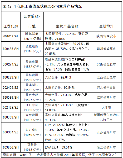 市值超过千亿元的10家光伏公司中,主营业务(占比超过10%)包含光伏组件的企业高达6家,占比6成,大大超过其他细分行业。