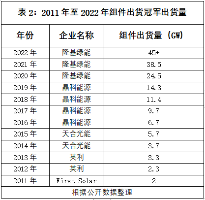 2011年前,全球光伏组件出货冠军还被外企占据,2012年之后则都来自中国企业,目前,隆基绿能已实现“三连冠”,超过英利和天合光能各自两次的冠军记录(表2)。至于其是否能追平乃至打破晶科能源2016年至2019年的“四连冠”,也成为光伏业内一大看点。