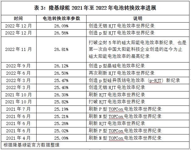 就在2022年12月,隆基绿能先后将无铟HJT电池效率世界纪录提高至26.09%,将p型HJT电池效率世界纪录提高至26.56%,并在2022年11月第一次由中国太阳能科技企业将尘封5年的硅太阳能电池效率新纪录提高至26.81%(表3)。