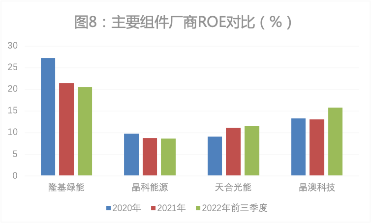 最终体现在平均净资产收益率(ROE)上,隆基绿能同样持续领先(图8)。2022年前三季度,隆基绿能的ROE为20.6%,力压晶澳科技(15.8%)、天合光能(11.6%)和晶科能源(8.6%)。同期,80余家光伏股ROE平均值为11.2%,隆基绿能在大光伏行业中,亦属于佼佼者。