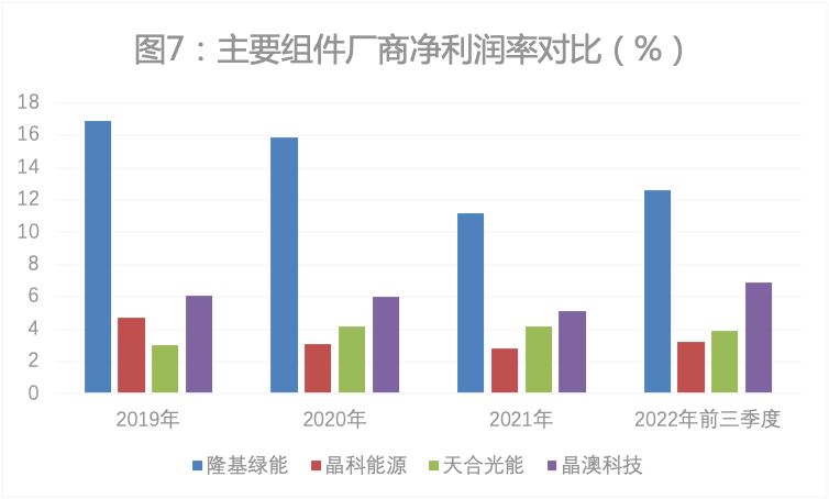 净利润率对比,隆基绿能更是一直遥遥领先主要组件同行。2019年、2020年,隆基绿能净利率达到16.9%、15.9%,超过晶澳科技、天合光能和晶科能源净利率总和(13.8%和13.3%)。2021年、2022年,隆基绿能的净利率领先优势有所收窄,2022年前三季度,其净利率达到12.6%,分别比晶澳科技、天合光能和晶科能源高出5.7、8.7和9.4个百分点(图7)。