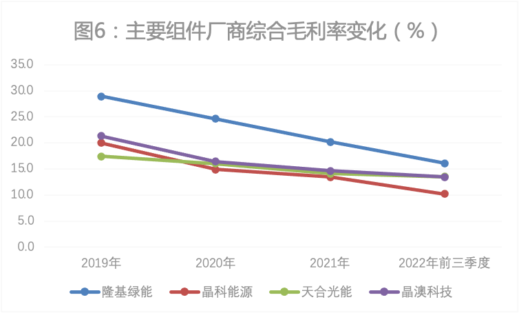 2019年以来,隆基绿能综合毛利率也始终领先。财报显示,2022年前三季度,隆基绿能综合毛利率16.1%,比天合光能(13.5%)、晶澳科技(13.4%)和晶科能源(10.2%)分别高2.6、2.7和5.9个百分点(图6),加上营收规模比同行高出数百亿,最终其净利润超过同行总和也就水到渠成。