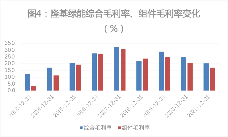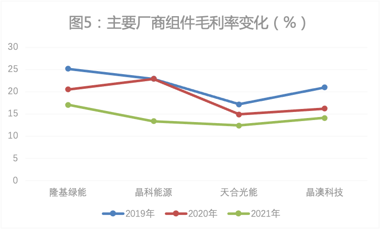 财报显示,2020、2021年,隆基绿能组件毛利率分别为20.5%,17.1%,同期天合光能、晶澳科技和晶科能源的组件毛利率大多在20%以下,隆基绿能在组件出货量大幅提升并夺冠的情况下,并未以牺牲毛利率作为代价,做到了“既要市场,又要利润”(图5)。