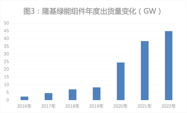 最近7年(2016年至2022年),隆基绿能组件出货量累计超过130GW(图3);其Hi-MO系列组件出货超100GW。2022年,隆基绿能预计光伏组件出货量超过45GW,是2016年(2.3GW)的20倍左右。